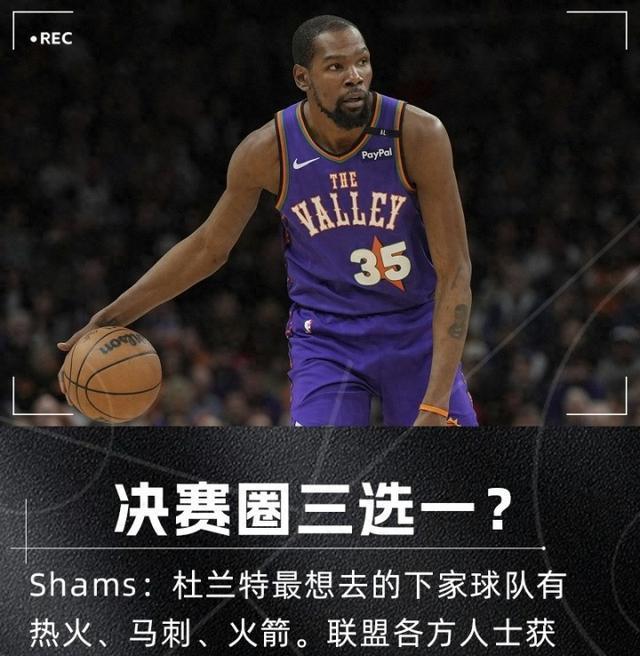杜兰特的交易一波三折,据The Athletic报道,杜兰特有三支心仪下家:马刺、火箭和热火,这三家都已经向太阳提出了正式报价,但太阳对他们给出的筹码非常失望。此外,杜兰特不愿意加盟的森林狼反而给出了太阳的理想报价(据说以戈贝尔和兰德尔为主要筹码),消息人士透露,太阳已向杜兰特阵营明确表示,他们需要在交易中优秀考虑球队能获得的最佳报价,球队正在说服杜兰特能对加盟森林狼产生兴趣。